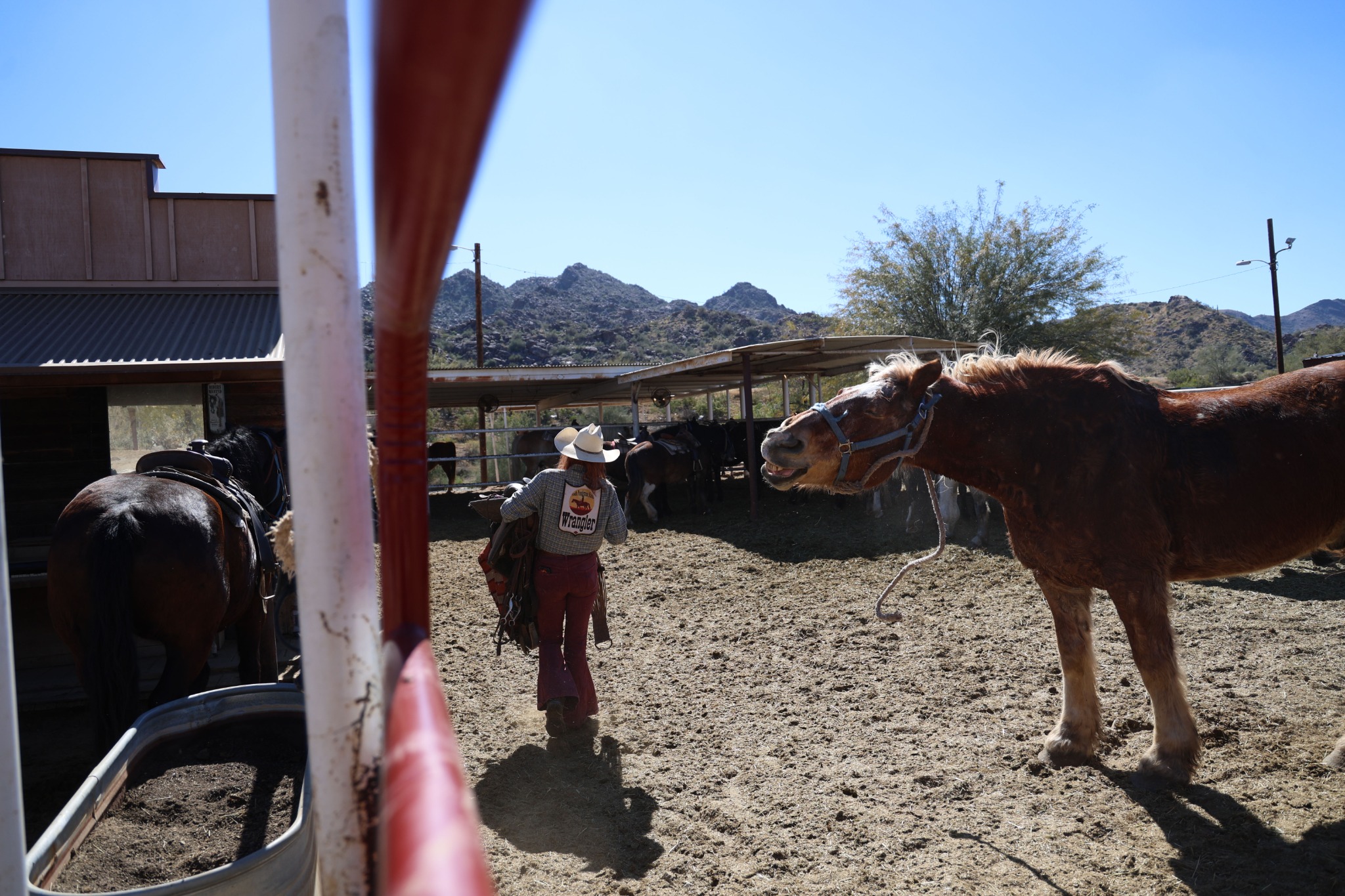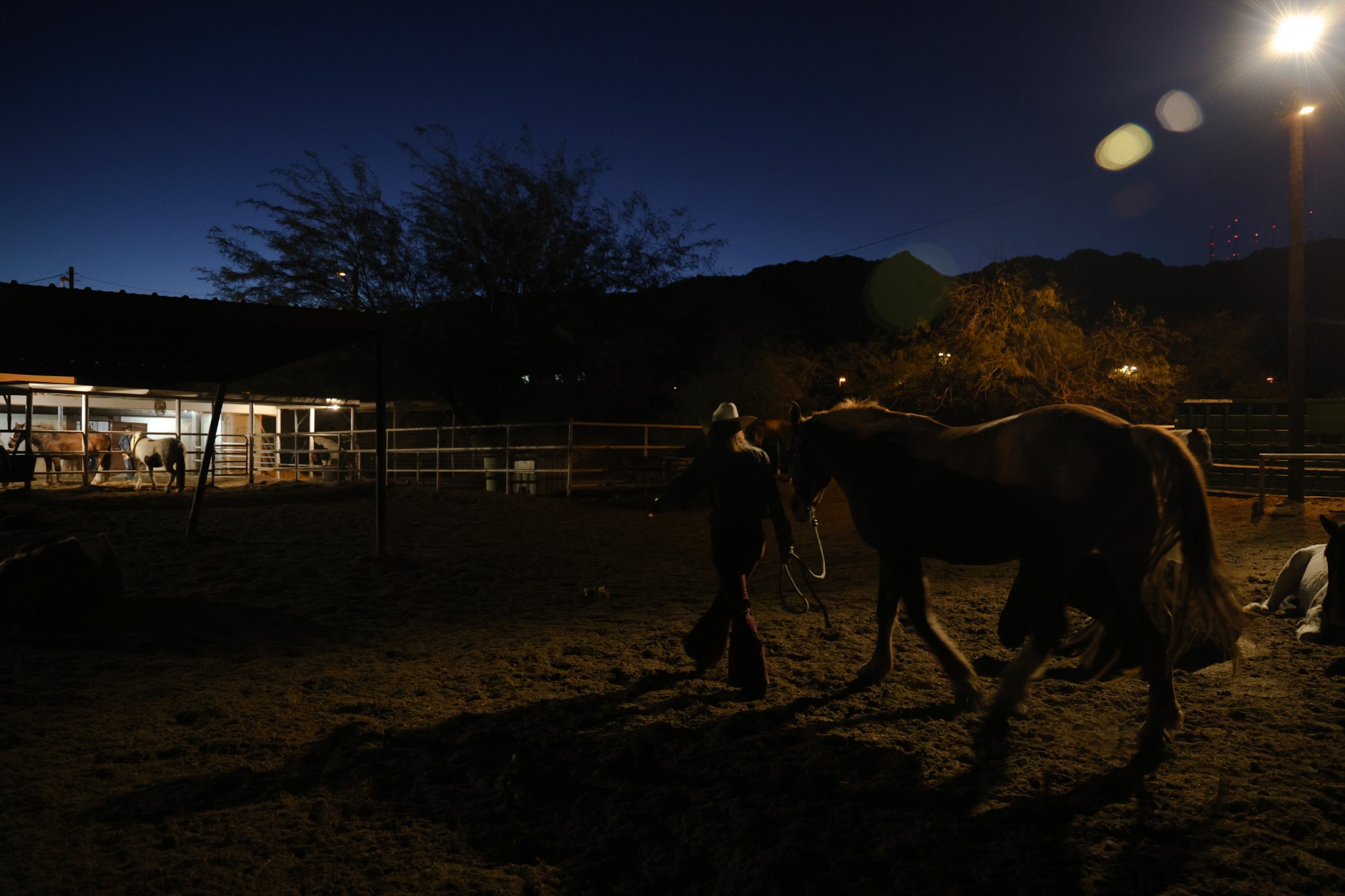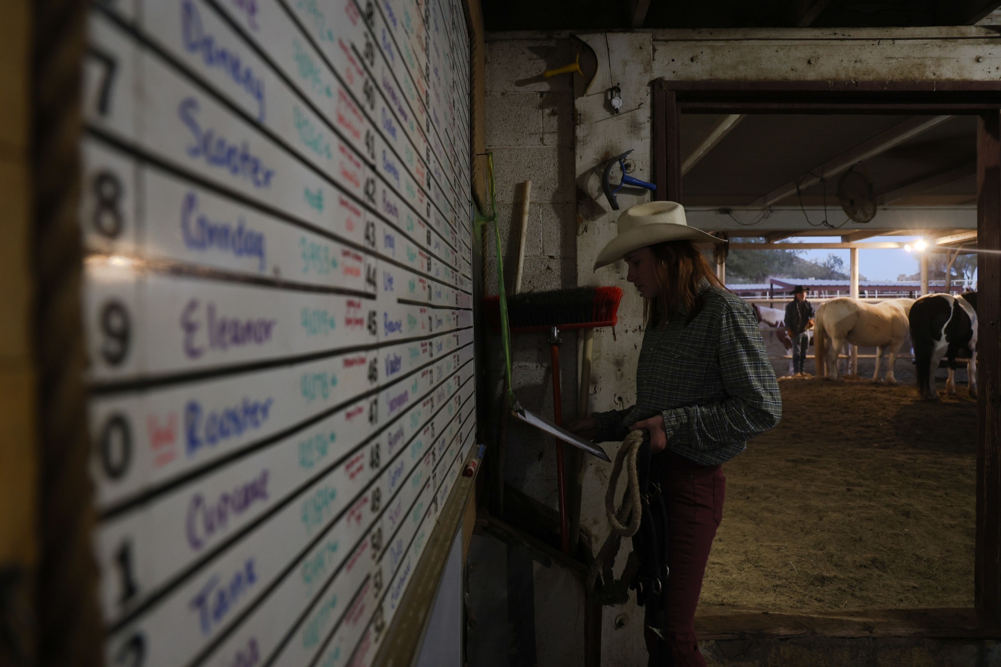 Hatch starts her day at 6 am by pulling horses from the field and setting them up for riders at Ponderosa Stables on Saturday, Feb. 14, 2026, in Phoenix, Ariz.