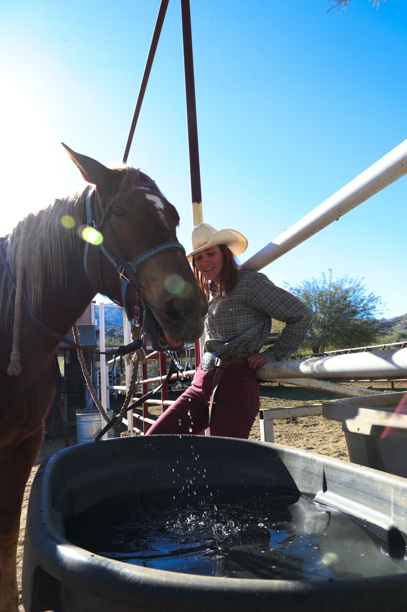 Hatch stops at a watering trough for her horse after a tour on South Mountain on Saturday, Feb. 14, 2026, in Phoenix, Ariz.